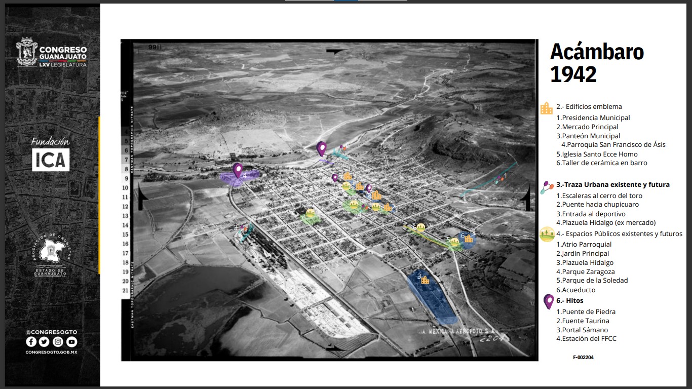 En esta toma aérea de la ciudad de Acámbaro fechada en 1942 se observan algunas construcciones destacables como la Presidencia, el Mercado principal y el Panteón municipales, la Parroquia San Francisco de Asís y algunos espacios públicos como el atrio parroquial, la Plazuela Hidalgo, el Parque Zaragoza y el Parque de la Soledad. En la parte superior de la foto discurre el río Lerma y se aprecian el Puente de Piedra y la Estación del Ferrocarril, con sus grandes bodegas y patios.