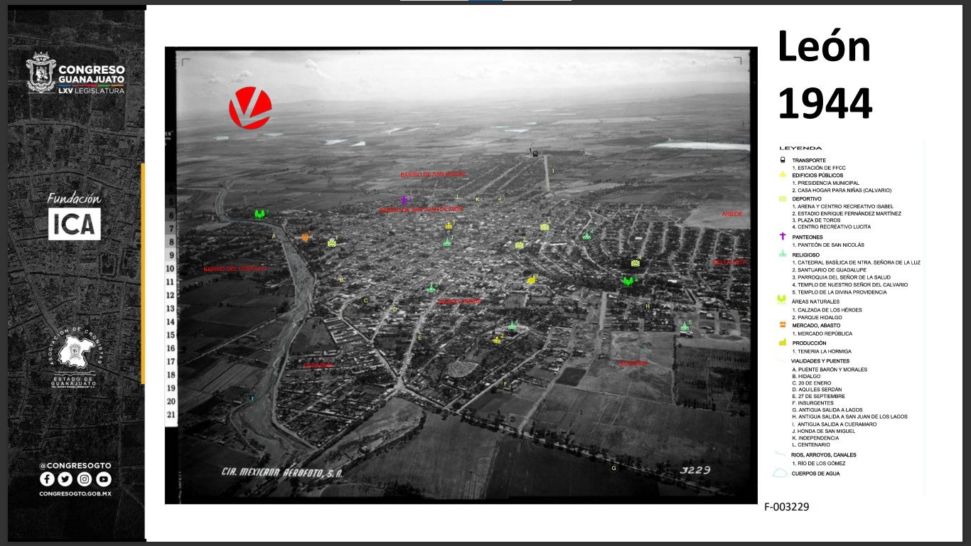 En esta imagen de León datada en 1944 se aprecia a la izquierda el Río de los Gómez con diferentes ensanchamientos y la elevación conocida como El Calvario, donde se construyó casa hogar para niñas y un templo del mismo nombre. En la foto se ubicaron al menos cinco iglesias: La Catedral Basílica, el Santuario, la Parroquia del Señor de la Salud, El Calvario y el Templo de la Divina Providencia que aún está en un margen urbano despoblado. Respecto a la actividad que para entonces aún era característica del municipio, la curtiduría, se registra la tenería “La Hormiga”, que subsiste hasta nuestros días.
