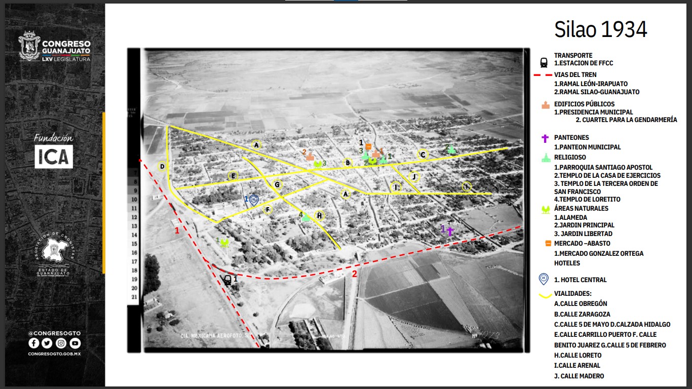 Vista de Silao desde suroeste en el 1934, donde se localiza la Estación de Ferrocarriles y sus vías, así como la Alameda. Se puede observar el Eje Central de la ciudad marcado por la Calle Obregón y la Calle 5 de mayo, que fungían como acceso y salida de la ciudad. En el área superior derecha de la imagen se aprecia la Parroquia de Santiago Apóstol, así como el Jardín Principal; además, se aprecia la Casa de Ejercicios, la cual se alza con la misma jerarquía arquitectónica que la propia parroquia.