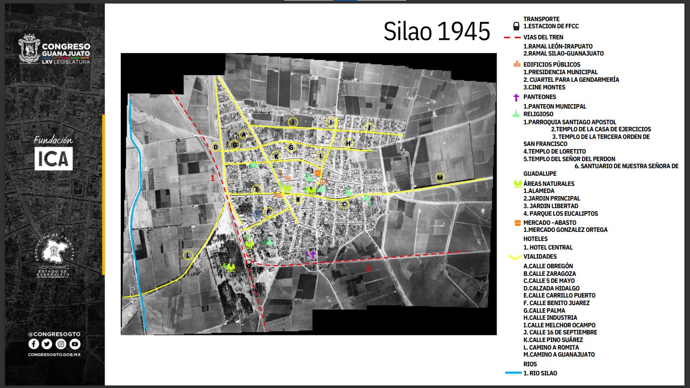 Conformado por tres fotografías verticales, este mosaico de Silao nos muestra la totalidad de la ciudad en 1945, compacta y densa junto a los terrenos colindantes de sembradíos y la vía de ferrocarril que pasa tangente a la ciudad. Se puede visualizar en la parte noroeste de la ciudad el acceso por la Calle Obregón, la cual intersecta por la Calle Zaragoza que lleva al Jardín Principal y a la Parroquia de Santiago Apóstol. De igual manera, se puede apreciar el trazo de la Alameda y el Parque Los Eucaliptos.