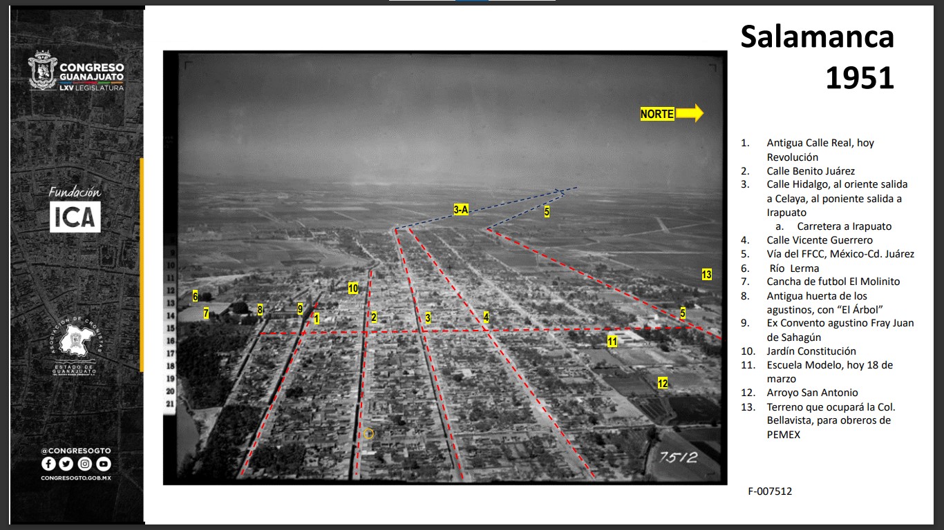 Observamos una traza urbanística donde destacan las siguientes vialidades: Calle Revolución, oriente-poniente, antigua Calle Real, Calle Benito Juárez, Calle Miguel Hidalgo, la Carretera a la ciudad de Irapuato Guanajuato, Calle Vicente Guerrero y la Vía FFCC, México – Cd. Juárez. Con elementos naturales como el Río Lerma y Arroyo de San Antonio. Centros de encuentro social y religioso como la antigua Huerta agustina, con “El Árbol”, el ex Convento agustino de Fray Juan de Sahagún y el Jardín principal o Constitución, así como la Cancha de fútbol “El Molinito”. Finalmente, el terreno que ocuparía la colonia Bellavista, para los obreros de PEMEX.