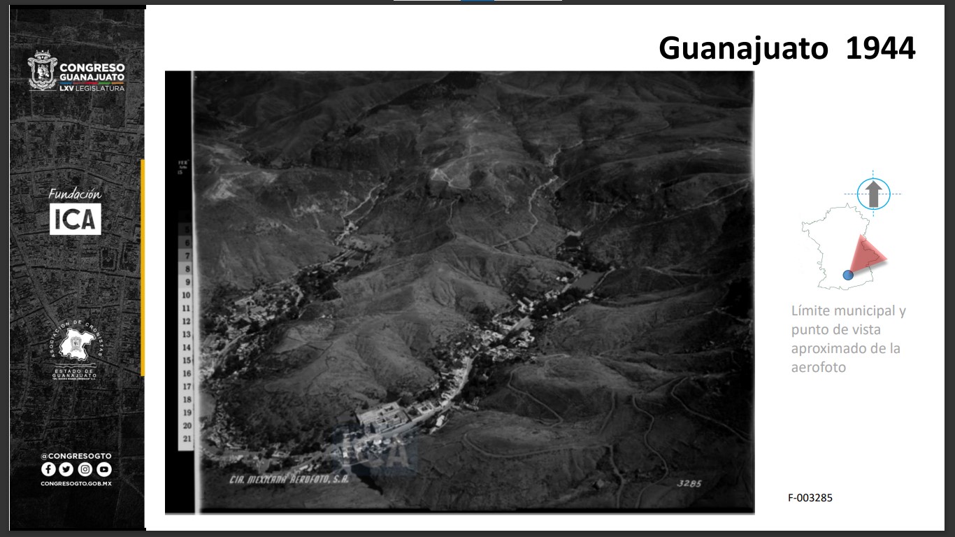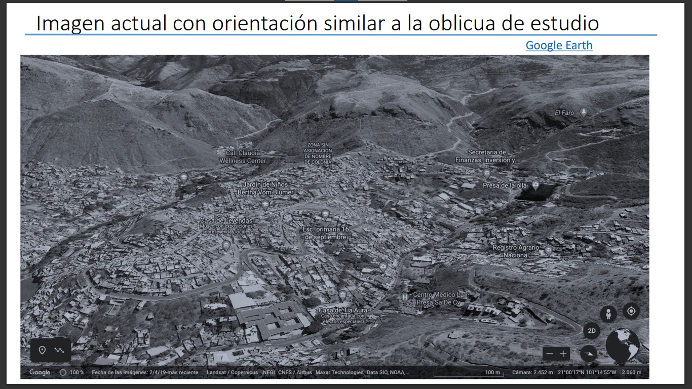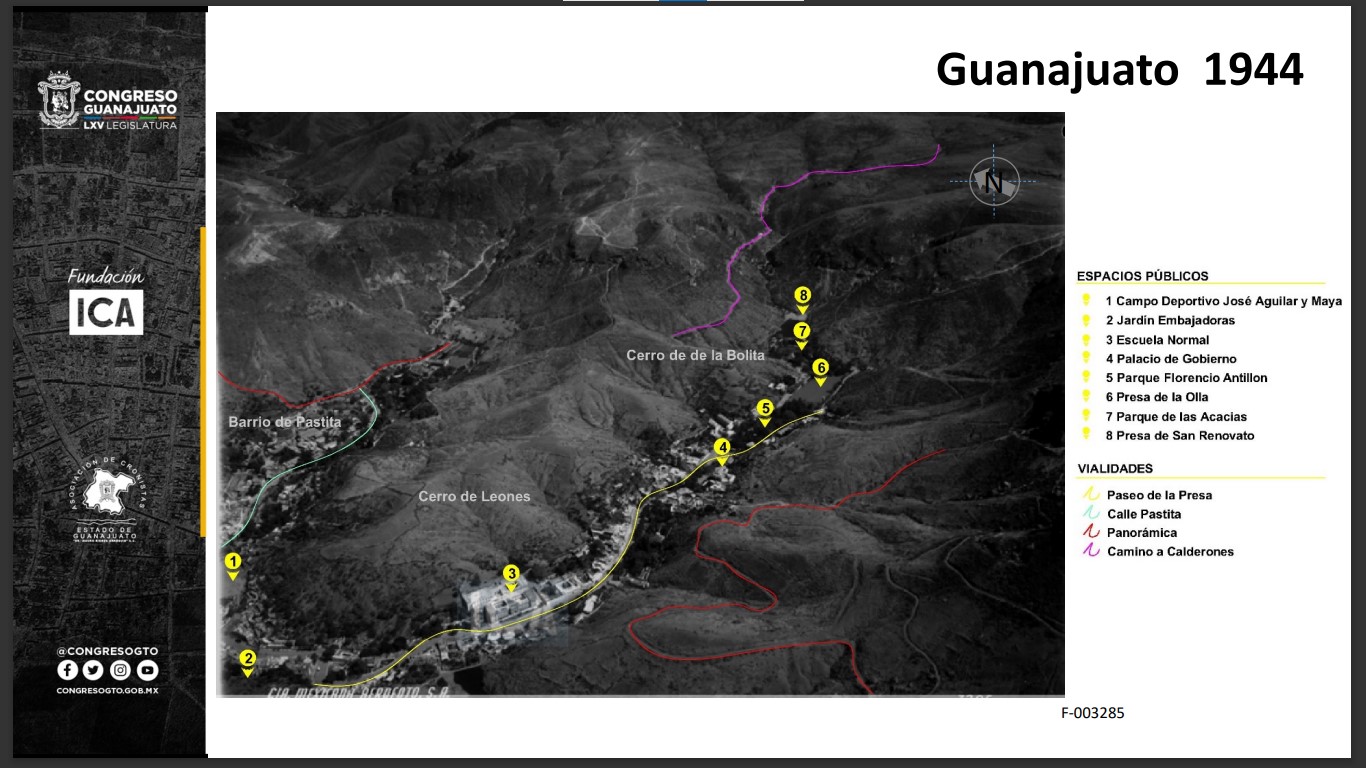 Se observan elementos característicos de la topografía capitalina como el Cerro de los Leones y el Cerro de la Bolita. Además, se pueden apreciar diversos cuerpos de agua como la Presa de la Olla, construida durante el siglo XVIII. Hacia al norte de la cuenca, tenemos la Presa Chica o de San Renovato. Entre ambas presas se encuentra el Parque Las Acacias, que se encuentra sobre el encofrado del puente que conecta a estos dos cuerpos de agua. Del lado derecho de la imagen se indica el Arroyo Las Comadres que alimenta el embalse de la Olla, el cual antecede al Parque Florencio Antillón. Dentro de la calzada o Paseo de la Presa, que arranca en la esquina inferior izquierda con un segmento del Jardín Embajadoras, se pueden prestar atención a edificios como el de la Histórica y Centenaria Escuela Normal de Maestros y donde hoy se ubica el Palacio de Gobierno.