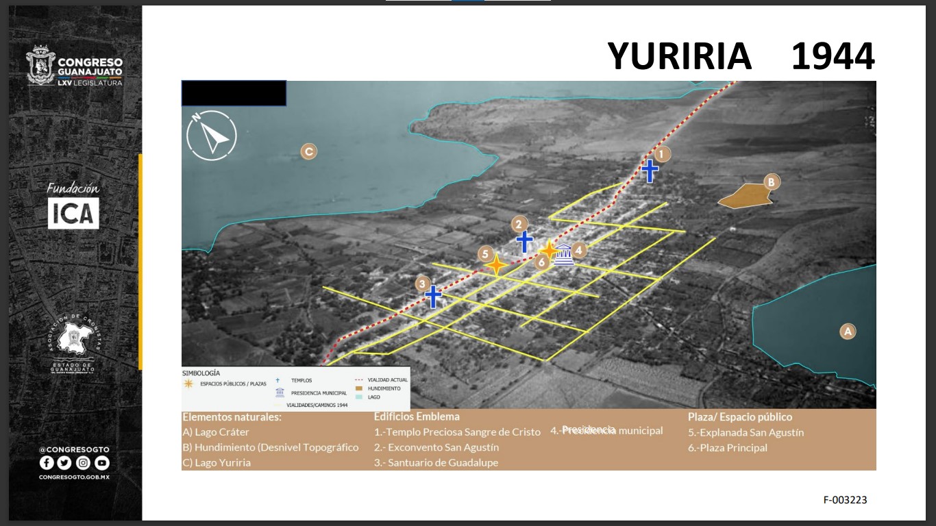Esta foto completa la vista magnífica de la Laguna de Yuriria, mientras que en el ámbito urbano destaca la ciudad completa con los edificios más importantes como: el Templo Preciosa Sangre de Cristo, el ex Convento San Agustín, el Santuario de Guadalupe y la Presidencia Municipal. Finalmente, los espacios públicos más importantes de la imagen: la Explanada San Agustín y la Plaza Principal.