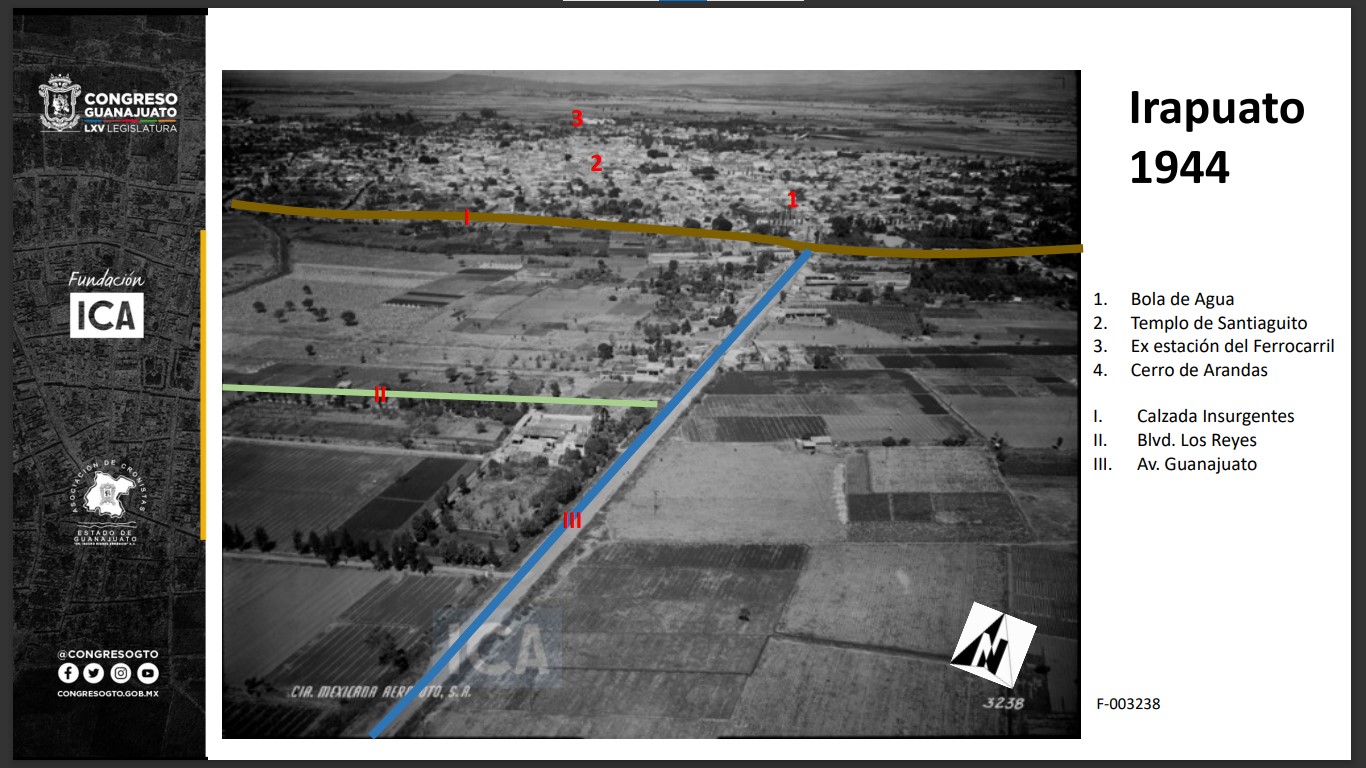 En la hoy denominada Calzada Insurgentes (antes de Guadalupe) circulaba antaño el tranvía, y para 1944, fecha de esta fotografía, observamos que se marcaba un borde de la zona urbanizada y el sur con grandes extensiones de sembradíos. Además, se alcanza a observar el Templo de Santiaguito, ubicado en la Calle Galeana y que data del siglo XIX; también se alcanza a ver la bola de agua que fue construida en 1937 y fue un tanque elevado que, sin estar a su máxima capacidad, lograba almacenar hasta un millón 200 mil litros de líquido. Al fondo de la imagen se observan la ex Estación de Ferrocarril, el Cerro de Arandas y los caminos que luego serán el Bulevar Los Reyes y la Avenida Guanajuato.